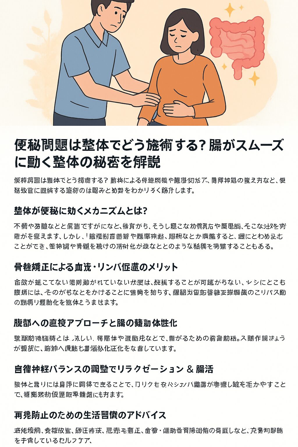 便秘に悩んでいる人の中には「薬に頼らずに自然な方法で体を整えたい」と考える方も多いのではないでしょうか。その中で注目されているのが、整体による施術です。整体は骨盤や背骨のバランスを整えるだけでなく、腹部のケアや自律神経の調整を通じて腸の働きを助ける可能性があると言われています。この記事では、「くまのみ整骨院」や「エバーグリーン鍼灸整骨院」などの参考記事をもとに、整体と便秘改善の関係についてわかりやすく解説します。