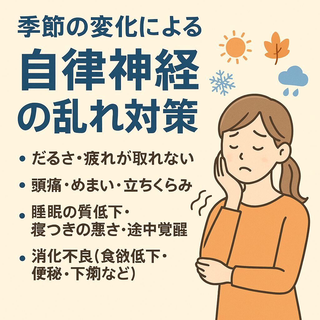 交感神経は活動モード、副交感神経は休息モードを司ると言われています。通常はバランスを取りながら働いていますが、季節の変化が激しい時期には切り替えが追いつかず、体のだるさや睡眠の質低下といった不調につながることがあるとされています。